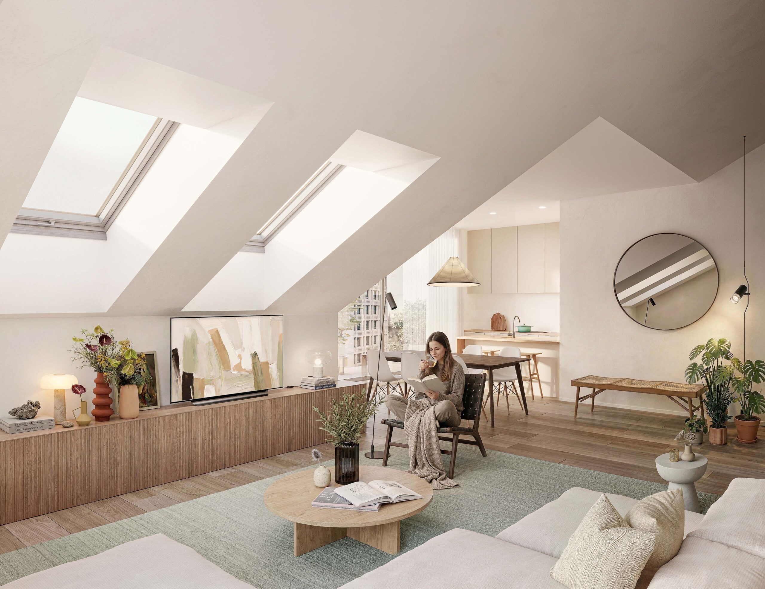 Appartements sous toiture uniques, avec volumes atypiques et vues dégagées. Avec 102 typologies différentes et des plans variés d’un étage à l’autre, chaque logement est réellement unique : il existe forcément une configuration adaptée à vos attentes.